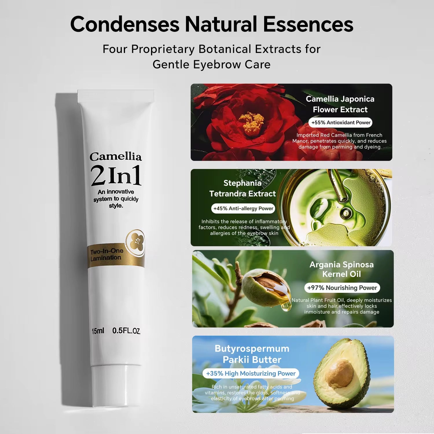 Enriquecido con proteínas hidrolizadas (queratina, trigo y colágeno) y extractos botánicos como camelia, argán y karité, que ayudan a mantener las cejas suaves, brillantes y con apariencia saludable.
